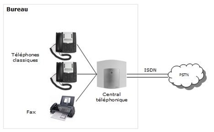 La téléphonie traditionnelle s’articule autour d’un central téléphonique classique, connecté à l’opérateur à travers des lignes ISDN (Twin, BA ou PRA).